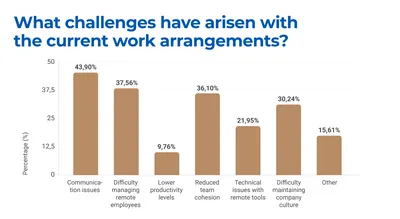 • 34.34% cited communication barriers as a major challenge, with 26.51% mentioning feelings of isolation or disconnection from their teams.