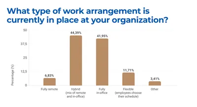 The survey results provide insights into the types of work arrangements and benefits currently in place across various organisations. In terms of work arrangements, a hybrid setup, which involves a mix of remote and in-office work, is the most common with 44.39% of organisations implementing this approach. Fully in-office arrangements are a close second, adopted by 41.95%. Flexible arrangements, where employees have the autonomy to choose their schedules, are in place at 11.71%. Meanwhile, 6.83% operate fully remotely and 3.41% reported using other types of work setups.