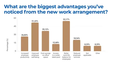 From the employee standpoint, the new work arrangements have brought a variety of benefits. A significant 59.04% of employees surveyed reported an improvement in work-life balance as the most commonly cited advantage. This was followed by a significant reduction in commute time, experienced by 49.40% of respondents. Flexibility in work hours was another key benefit, highlighted by 42.77%.